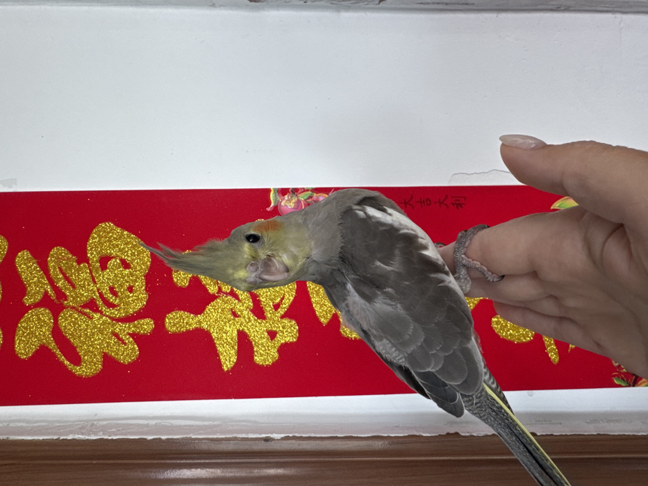 An indoor scene in Longhua District, China, depicts a cockatiel perched on a human index finger. The grey-bodied bird, with a yellow crest, yellow cheek patches, and orange ear patches, faces the viewer with its beak slightly agape and crest moderately raised. Its talons are firmly grasping the light-skinned index finger, which has a clear-polished thumbnail visible to the right. Behind the bird, a vertical red banner is affixed to a wall, featuring large, glittery gold Chinese characters. The character "福" (fú) is prominent at the top, with "大吉大利" (dà jí dà lì) visible below. To the left of the banner, a section of a brown wooden door frame or trim is visible. To the right, the background transitions to a plain white wall.