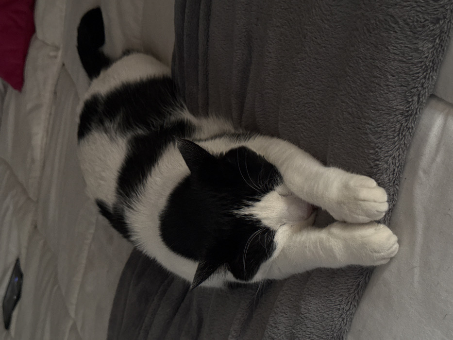 - "The scene depicts a black and white domestic cat resting stretched out on a bed in a bedroom in Mexico City, Mexico" by FM-wiiP12, licensed under CC BY 4.0