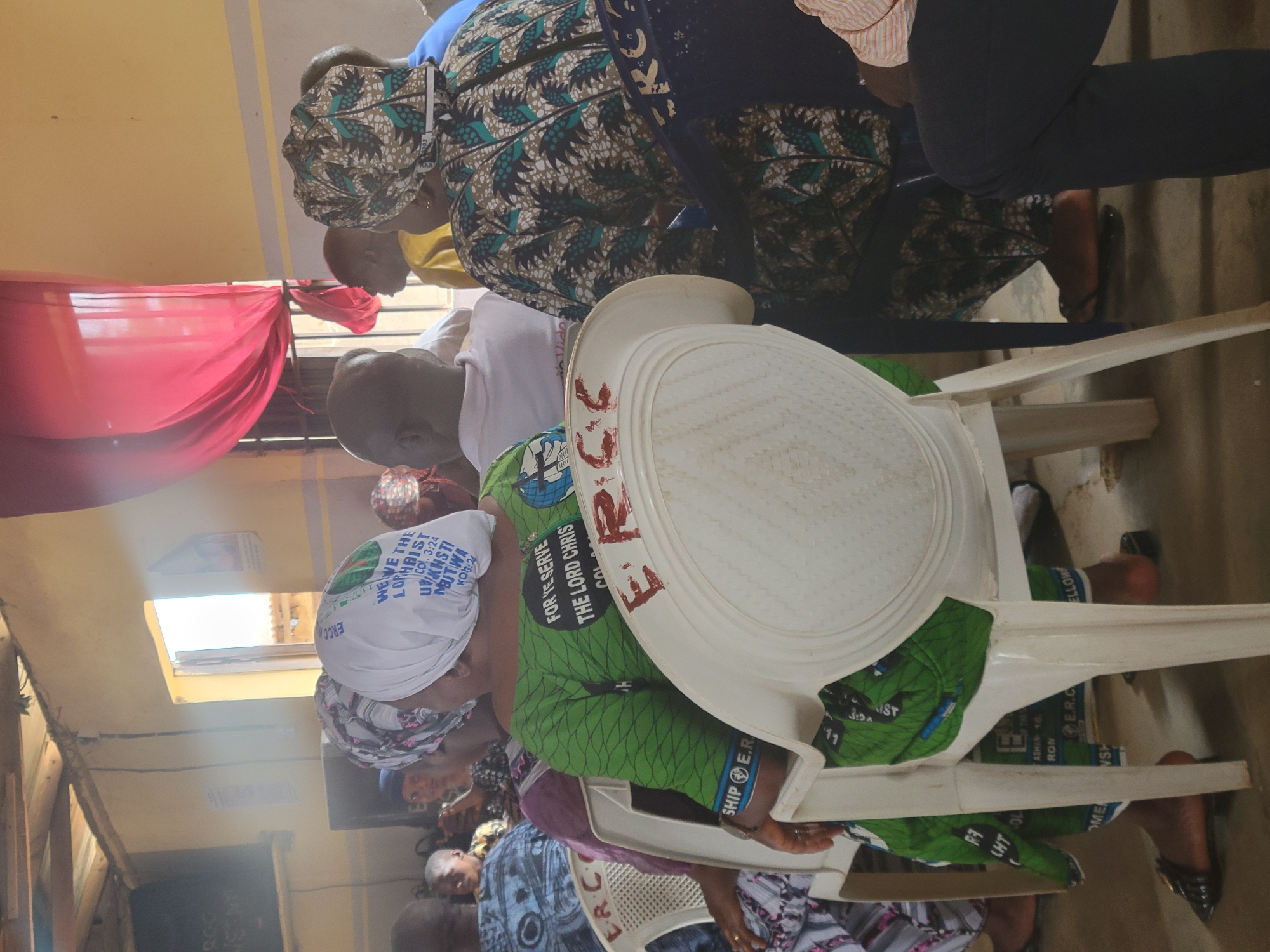 A group of people are seated on plastic chairs in an indoor space. Some of the individuals are wearing colorful patterned clothing and head coverings. A woman in a green patterned dress is seated in the foreground, with the back of a white plastic chair partially obscuring her. "ERC" is written on the chair. Visible text on clothing includes phrases like "FOR YE SERVE THE LORD CHRIS," "WEWE THE LOMHAIST," and "SHIP E.R." A red curtain hangs in the background and the environment appears to be a simple community gathering space. The image was taken in Kwamba, Nigeria.