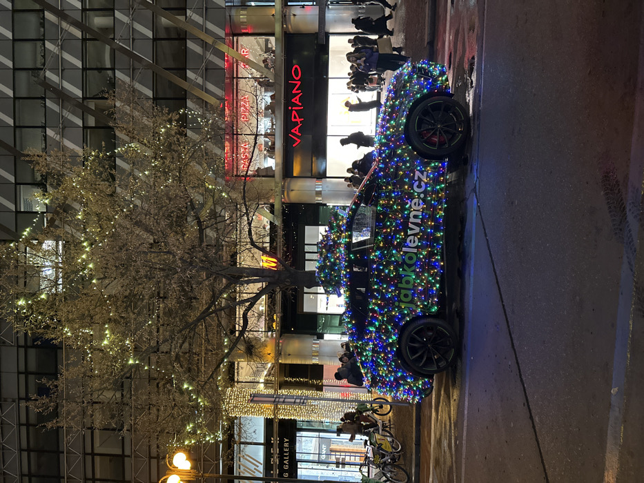A car adorned with multicolored Christmas lights sits on a street near a building. A tree with string lights stands next to the car. People are visible in the background, congregating near a storefront with a "Vapiano" sign. Bicycles are parked nearby. The lighting and composition create a festive urban scene.