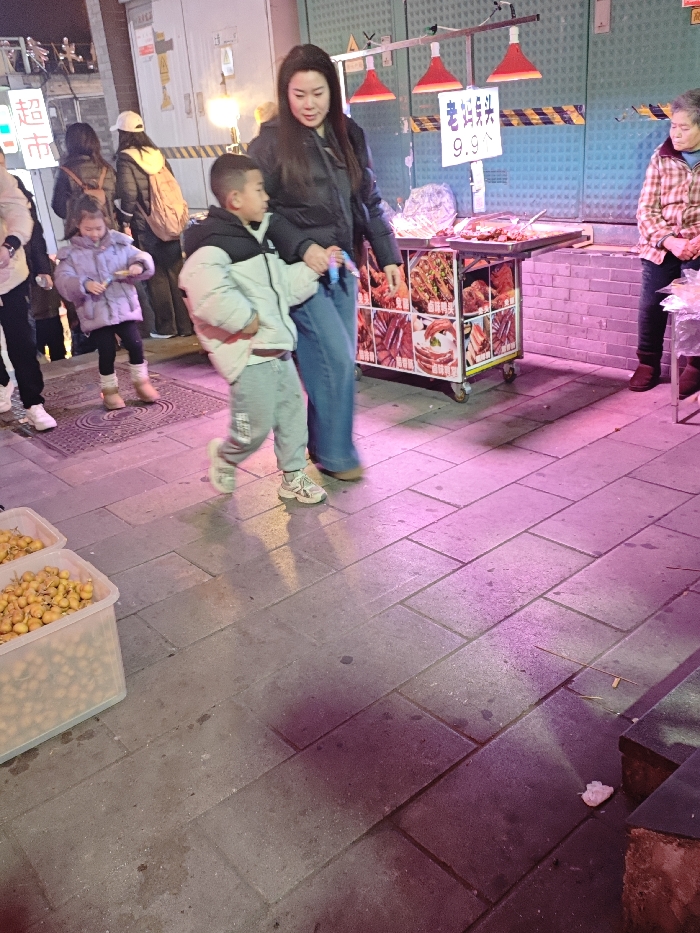 The image depicts a nighttime street scene in Yuzhong District, China. In the central foreground, an adult female with long dark hair, wearing a dark padded jacket and blue wide-leg jeans, holds the hand of a young male child. The child wears a light-colored puffer jacket and gray pants, with his left foot stepping forward. To their right, a metal food cart displaying skewers of various prepared food items is positioned against a light-colored wall. Three red heat lamps hang above the cart, and a white sign with Chinese characters "老妈子头" and "9.9" is visible. An elderly female in a plaid shirt stands behind the food cart on the right. In the left background, a young female child in a purple puffer jacket walks, holding an object. Other indistinct pedestrian figures are partially visible further left, near a sign fragment that reads "超市" (supermarket). The foreground ground is paved with rectangular gray stones, showing wear, and contains two clear plastic bins filled with small, light-colored spherical produce items. The scene is illuminated by artificial light, with a prominent pink/purple hue cast on the pavement and the wall behind the food stall. A circular manhole cover is visible on the left pavement, and small pieces of refuse are scattered on the right pavement.