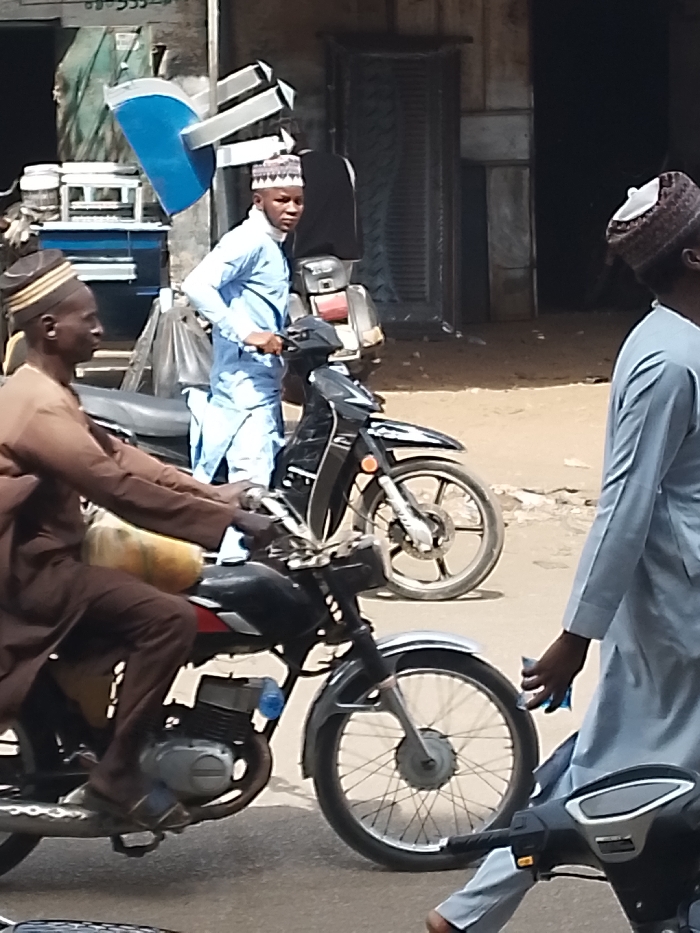 The scene captures an active street in Kofar Mazugal, Nigeria, under bright natural light