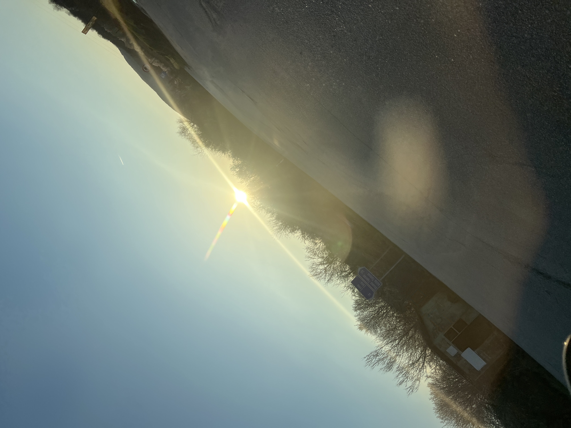n outdoor scene in Rayuvtsi, Bulgaria, captured at a tilted angle. A road runs along the top right of the image. Bare trees line the edge of the road. The sun is positioned centrally in the image, creating a bright glare with lens flare effects. A blue sign with white text, presumably a road sign, is visible near the tree line on the right. The sky occupies the lower portion of the image, appearing blue and slightly hazy due to the sunlight. A thin white contrail from a plane is visible in the sky.