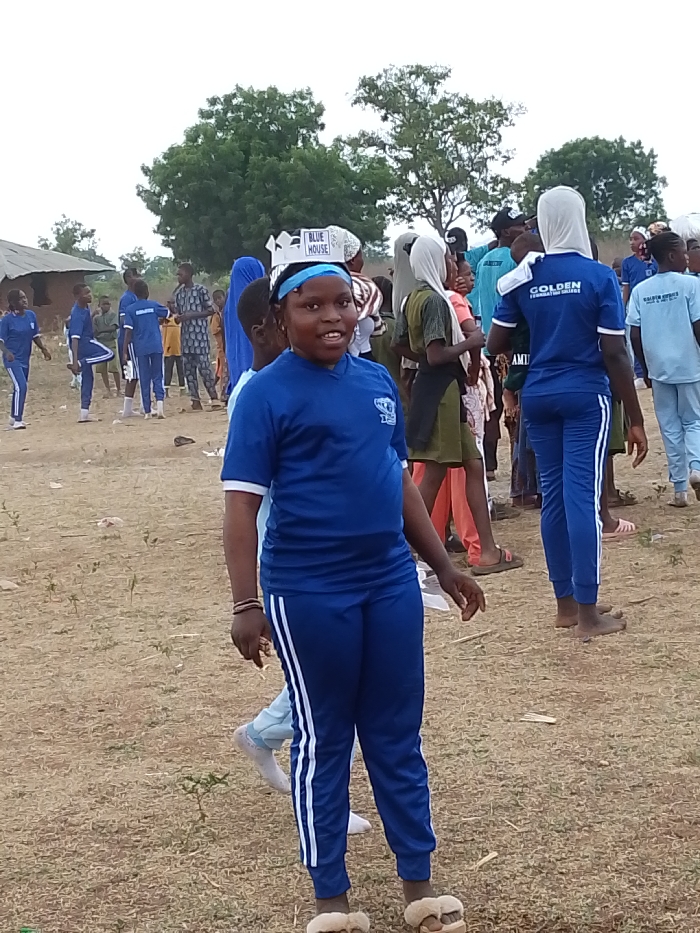 A young girl stands prominently in the foreground in Oduma Hill, Nigeria, smiling at the viewer. She is wearing a blue short-sleeved shirt with white trim on the sleeves and a small white logo on the left chest, paired with matching blue track pants featuring two white stripes down each side. On her head, she has a blue headband and a white paper crown with "BLUE HOUSE" printed in blue text. Multiple brown, bead-like bracelets are visible on her left wrist, and she wears fluffy, light-colored slippers. In the mid-ground, numerous individuals are gathered on dry, reddish-brown earth with sparse green plant growth. Many wear similar blue athletic attire, suggesting uniforms. One individual, facing away from the camera in the mid-right, wears a blue shirt with "GOLDEN FOUNDATION COLLEGE" printed on the back in white text, and matching blue striped pants. Other background figures wear various casual clothing, including patterned garments and head coverings. In the far background, large green trees are visible beneath a bright sky, along with a simple building structure to the left. The assembled individuals appear to be standing or milling about.