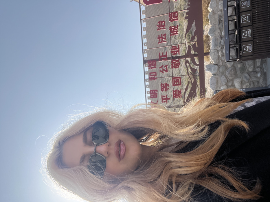 - "A fair-skinned individual with long, wavy blonde hair and dark sunglasses is positioned prominently in the foreground, facing the camera for a selfie" by FM-VYYYD2, licensed under CC BY 4.0