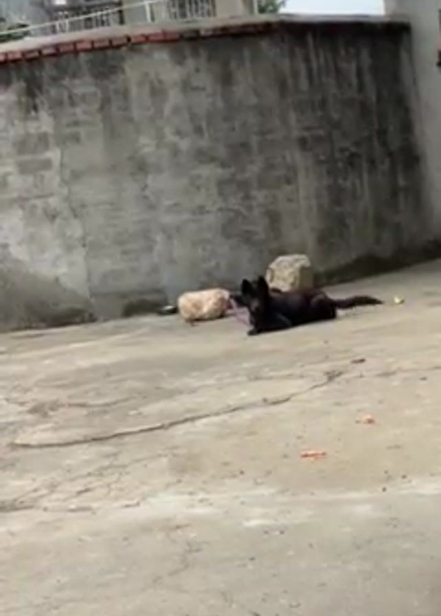 A black dog lies on a concrete surface in a yard enclosed by a gray block wall. A tan rock sits near the dog. The yard is strewn with small, colorful objects. A building can be seen in the background. Voices can be heard.