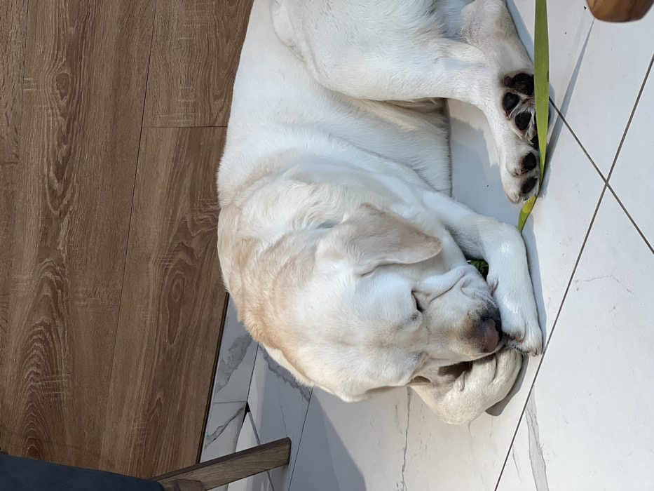 - "A light-colored (cream/yellow) Labrador Retriever is depicted lying on its left side on a tiled floor in an indoor setting in Mytishchi, Russia" by FM-Vgo2F2, licensed under CC BY 4.0