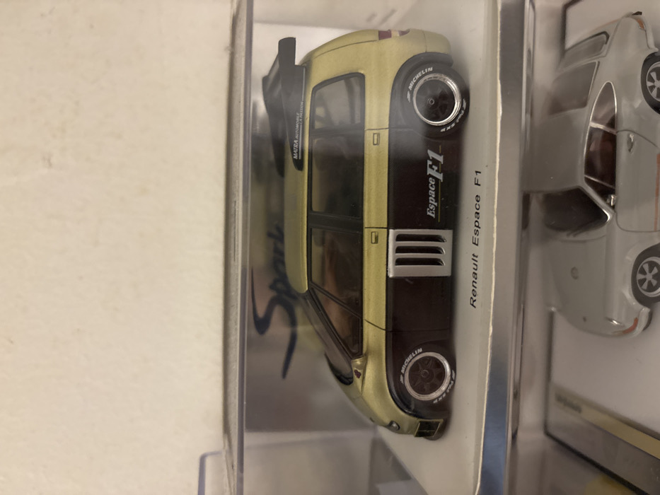 The image displays a close-up, eye-level view of two miniature model cars stacked vertically within clear plastic display cases against a plain, light-colored background. The upper display case contains a 1:43 scale model of a Renault Espace F1. The model is two-toned: the upper section, including the roof and hood, is a metallic light gold or bronze, while the lower body is dark brown or black. It features a prominent black rear spoiler marked "MATRA AUTOMOBILE," silver vertical intake vents on the lower side panel, and "Espace F1" text in gold and black on the dark body section. The wheels are black with polished rims and "MICHELIN" branding clearly visible in white on the tire sidewalls. The model rests on a white base with "Renault Espace F1" printed in black text. A 'Spark' logo is partially visible on the silver backing card behind the model. The lower display case, partially visible, contains a model of a light grey or silver sports car, identifiable as a Porsche 911 variant due to its distinct roofline and rear engine cover detail. The model exhibits a multi-spoke wheel design. The environment appears to be an indoor setting, likely a domestic or hobbyist display area, with a smooth, off-white wall serving as the background. No individuals are present. The scene is static.