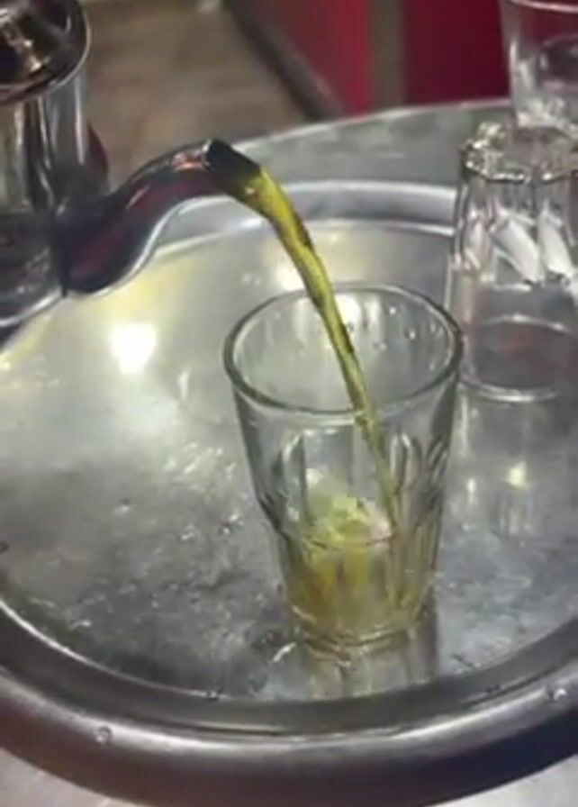 someone pouring tea from a shiny metal teapot into a small, clear glass on a round, silver tray. There are a couple of other small glasses in the background on the same tray. The tea appears to be a light brown or golden color as it pours. The surrounding environment is somewhat blurry, with a red surface visible behind the tray.