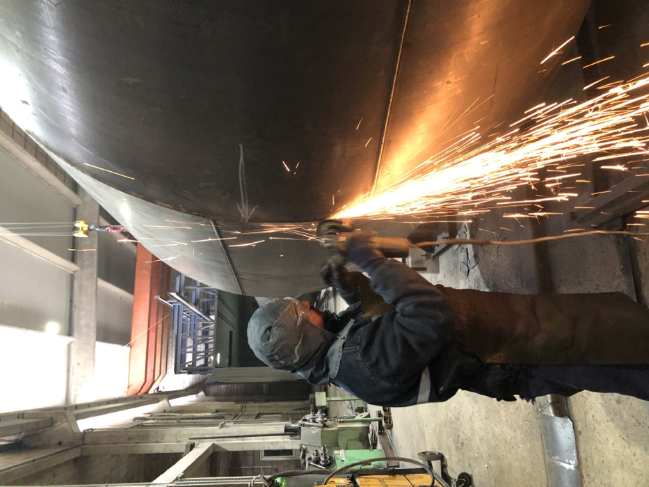 In an industrial workshop located in Zaljevo, Montenegro, a lone individual is depicted operating an angle grinder on a large, dark grey, cylindrical metal structure