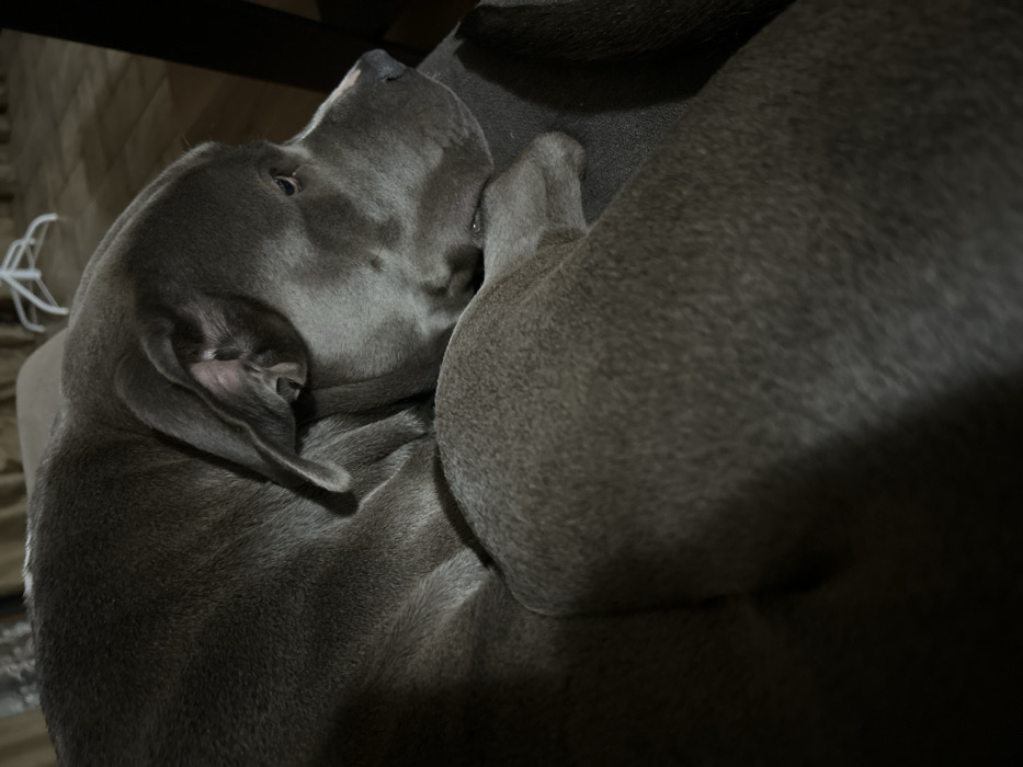 - "The scene depicts a large, short-haired dog with blue-grey fur, resting on an upholstered surface, likely a sofa or cushion, within an indoor environment in the city of Aheloy, Bulgaria" by FM-LHe1m2, licensed under CC BY 4.0