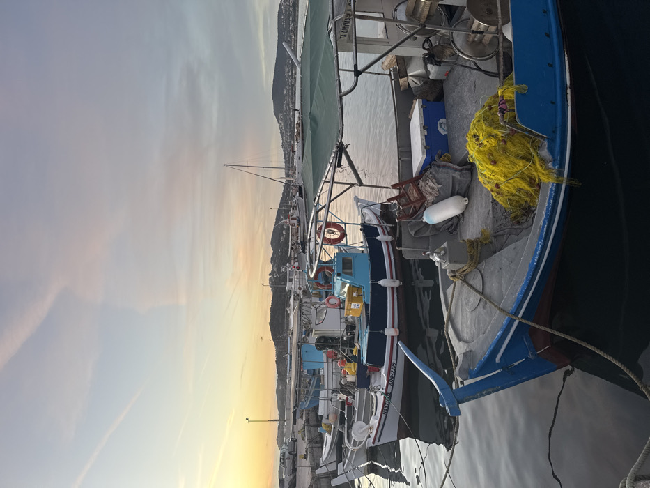Several boats dock at a harbor. The boats, varying in size and color, are equipped with fishing gear such as yellow nets, ropes, and buoys. Their colorful exteriors feature white, blue, and red details. In the background, a coastline stretches along the horizon under a sky transitioning from golden sunlight near the water to pale blue at the top. A few sailing boat masts are visible among the docked fishing boats.