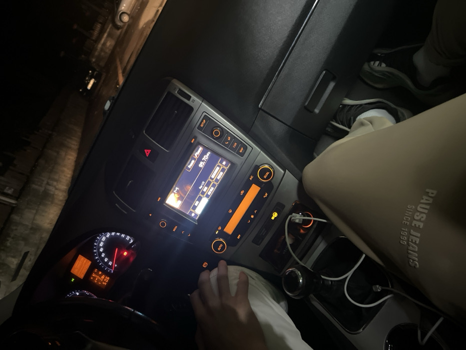 The image depicts the interior of a stationary vehicle at night, observed from a forward-facing perspective within the passenger compartment, located in the city of Svishtov, Bulgaria. The illuminated dashboard displays a speedometer indicating 0 km/h and a tachometer at a low idle, along with a digital clock showing "5:06." A red warning light and an amber warning light are active. The center console features a multimedia display showing "95.70 Mhz" on the FM radio. Climate control settings are visible with amber backlighting, including "AUTO" and "DUAL" buttons. A manual gear stick is present below the console. A white USB charging cable is connected to an orange-illuminated adapter in a 12V socket. A left hand, presumed to be the driver's, is resting on the center console near the manual gear shift. The individual wears light-colored clothing. The legs of a passenger are visible in the foreground, clad in beige sweatpants with "PAUSE JEANS SINCE 1999" printed on the left thigh. This individual wears dark athletic shoes with white soles and white socks. Through the windshield, a dimly lit urban environment is visible, characterized by dark building walls to the left and indistinct parked vehicles in the distance under artificial lighting.