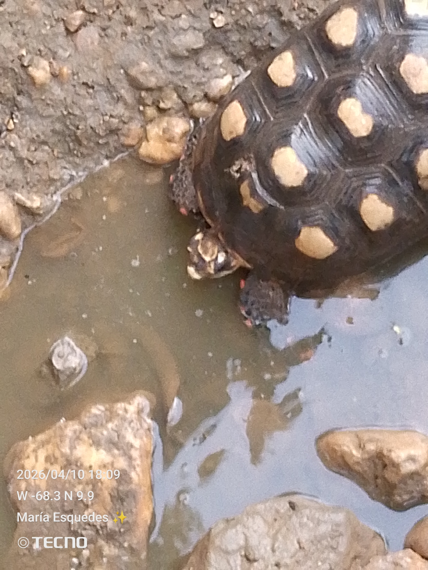 turtle in a puddle. The turtle has a dark shell with light brown spots. The puddle is surrounded by rocks and mud. The location is Unknown, Unknown. The date and time are 2026/04/10 18:09, and the coordinates are W -68.3 N 9.9. The image was taken by María Esquedes using a TECNO phone.
