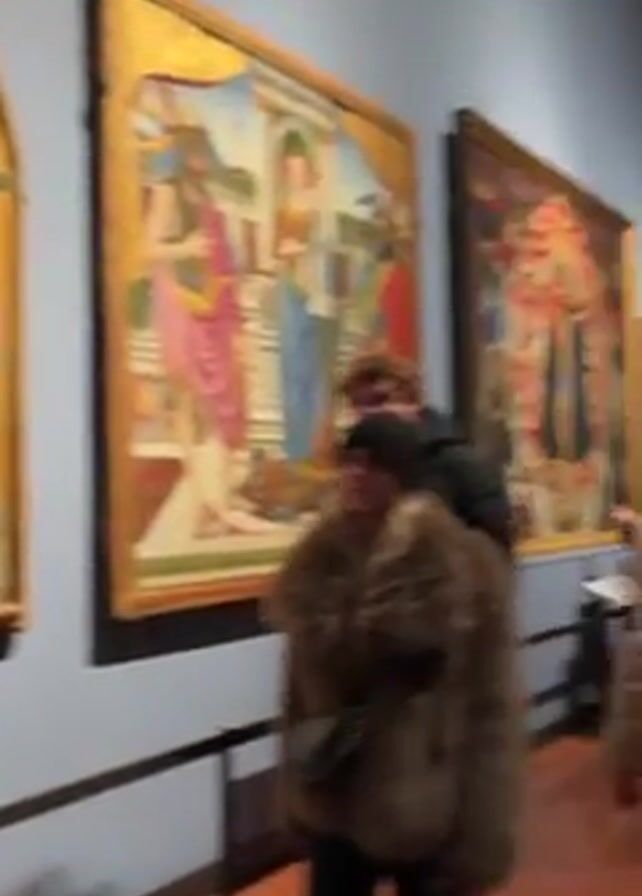interior of an art gallery. Several people are walking around or sitting on benches, observing the artwork on display. The walls are painted a pale blue. The room is brightly lit. The artwork consists of paintings and sculptures, including large, framed paintings hanging on the walls and a tall sculpture of three figures on a pedestal. People are dressed in casual clothing, including coats and sweaters. Some are wearing hats. The camera moves through the room, capturing the various artworks and the people viewing them.