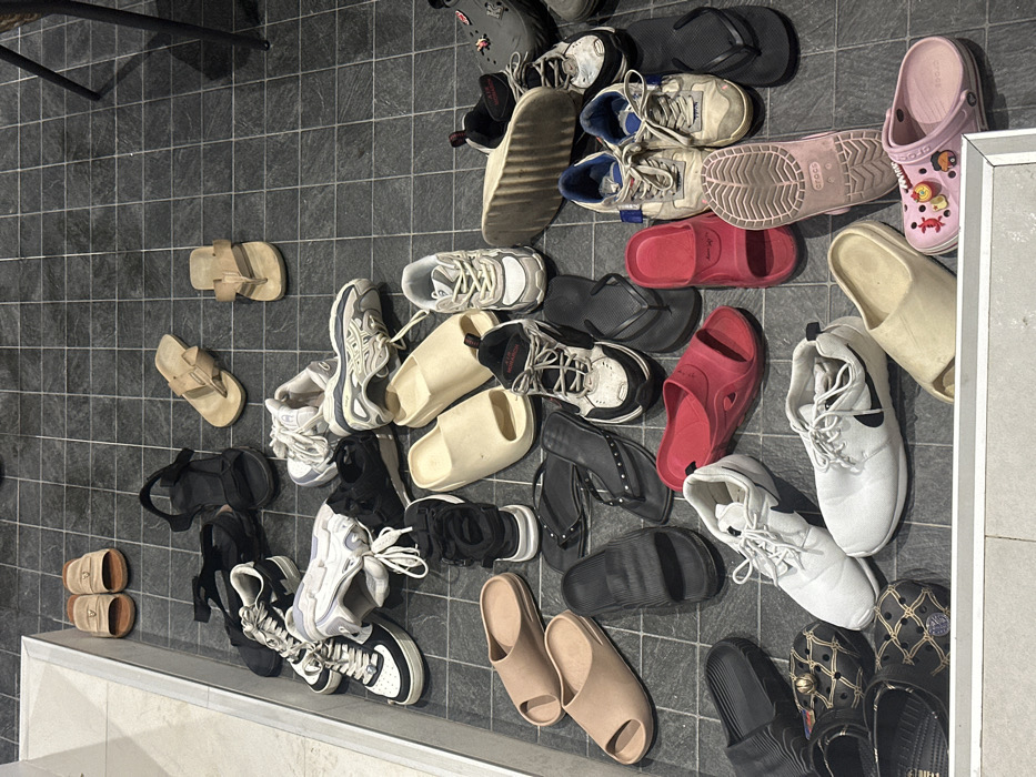- "The image displays numerous pairs of assorted footwear dispersed haphazardly across a dark gray tiled floor within a building in Si Sunthon, Thailand" by FM-8PR5n2, licensed under CC BY 4.0