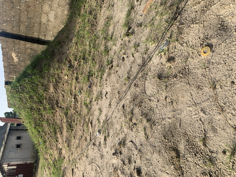 dirt path in front of a small hill covered in grass. There is a concrete wall in the background. The dirt path is covered in small tufts of grass. There are a few pieces of trash on the ground. There are no people in the image. The image was taken in Umuola, Nigeria, at latitude 4.887 and longitude 7.031.