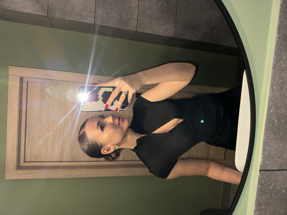 A female individual is depicted in a mirror selfie taken indoors