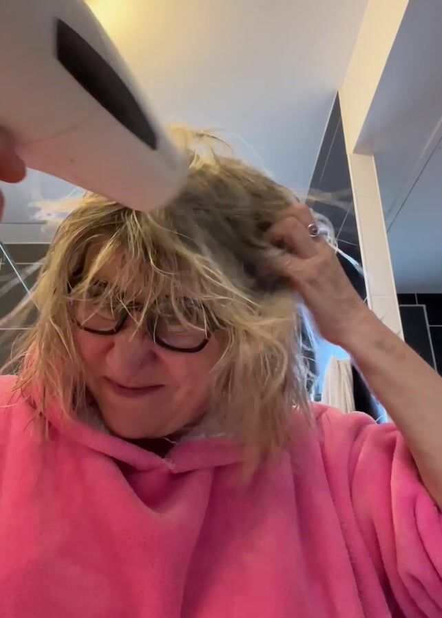 A woman in a pink hoodie is drying her wet, blonde, shoulder-length hair with a white hair dryer. She is wearing glasses and looks directly at the camera with varying expressions, including scowling and smiling slightly. Her right hand is visible, wearing a ring. The background shows a bathroom with black and white tiled walls, a light fixture, and a doorway. The video is shot from a low angle, looking up at the woman.