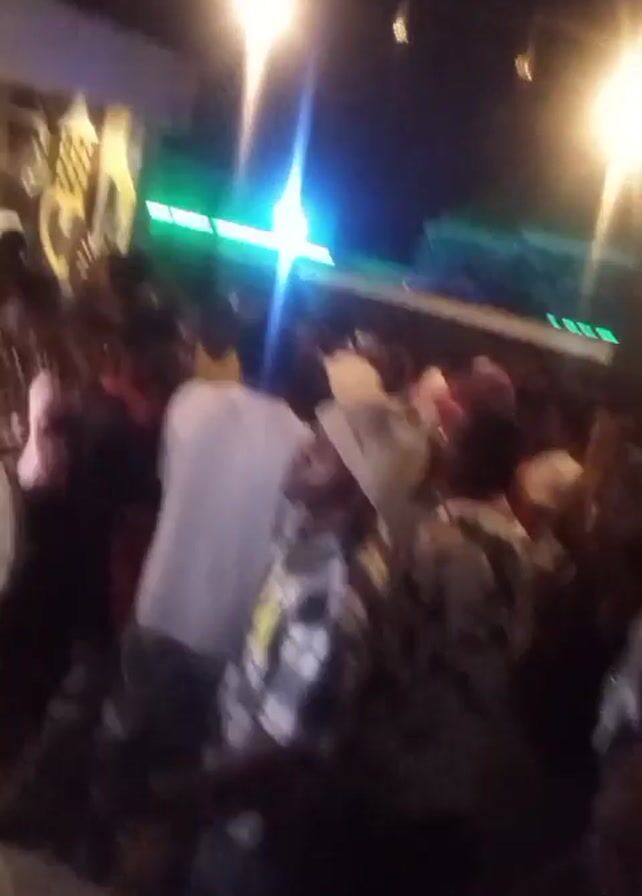 crowded indoor space, possibly a nightclub or bar, with many people dancing and socializing. The lighting is dim, with bright overhead lights creating glare. The crowd appears to be mostly young adults, and they are dressed in casual clothing. The camera movement is shaky.