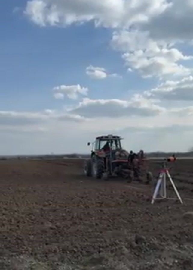 maroon and green tractor plowing a field. The tractor is in the middle of the frame, moving from right to left across a field of dark brown soil. Behind the tractor, the plowed soil is visible, with a tripod set up on the edge of the field. The sky is blue with scattered white clouds. In the distance, a slightly hazy skyline can be seen.
