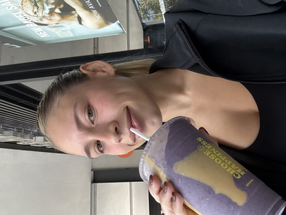 A woman holds a layered smoothie in a clear plastic cup with a straw. The smoothie's colors are purple and yellow. She wears a black athletic top with a visible zipper. Her hair is blonde, pulled back from her face. A restaurant advertisement hangs in the background, featuring a bagel sandwich. She has fair skin and is looking at the camera with a slight smile. The cup displays the words "CHOOSE HAPPINESS" in a yellow font. Her manicured nails are visible.