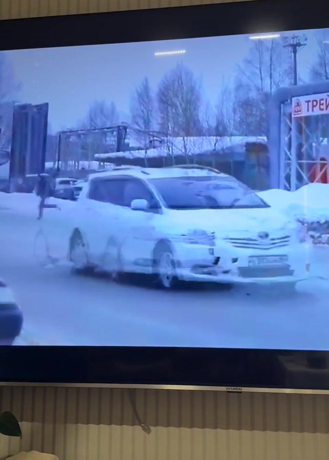 scene playing on a television. The setting appears to be a snowy landscape, likely a street or road, with parked cars in the background. A dark, four-legged animal, possibly a dog or a small bear, is seen crossing the road. A green bus passes by in the opposite direction. The camera is focused on the television screen, capturing the moving image. In the foreground, outside of the television, are a plant and a white pitcher on top of a wooden TV stand.