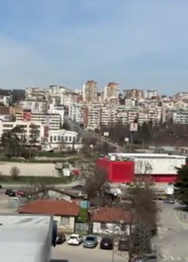 cityscape under a light blue sky, viewed from an elevated position. Numerous apartment buildings are visible, predominantly white, with red and brown roofs. A large red building with white signage is also noticeable, potentially a store or commercial establishment. Trees are scattered throughout the scene, some without leaves. Cars move along the roads below. The camera perspective shifts slightly during the video, causing the view to rotate.