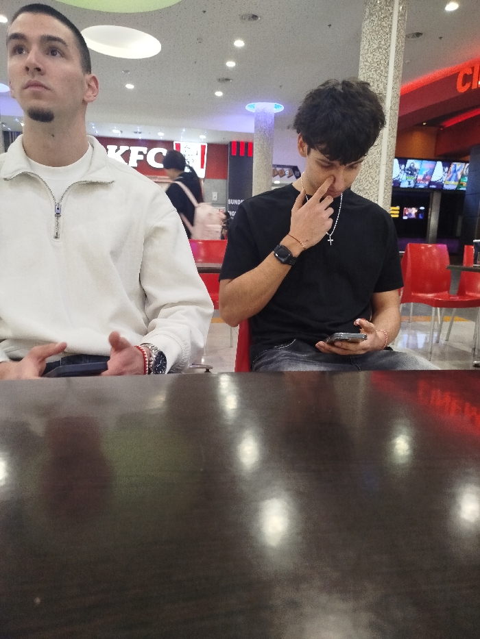 - "The image captures two young adult males seated at a dark, reflective table within an indoor commercial complex, consistent with a food court or shopping mall" by FM-e7vHt1, licensed under CC BY 4.0