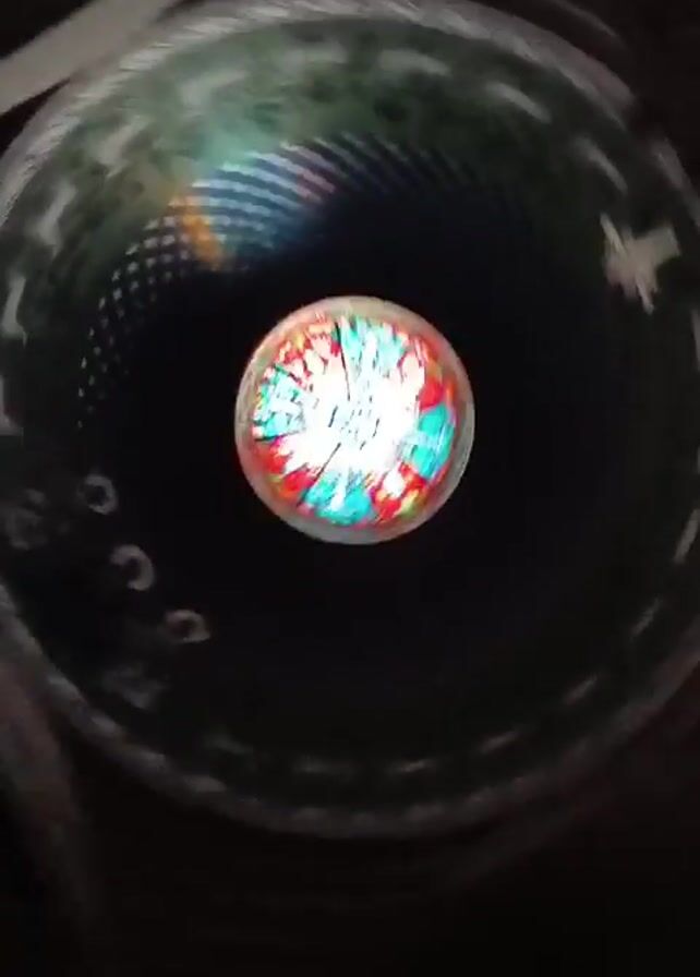 A first-person perspective shot looks up through a tube-like structure towards a circular stained-glass window. The tube's inner surface is textured with a spiral pattern and occasional cross symbols. Light shines through the stained glass, creating a vibrant, colorful pattern. The person holding the camera slightly adjusts its position, causing the perspective of the window to shift within the tube.