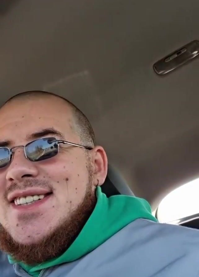 A man with a light beard and short-cropped hair is in a car, wearing sunglasses, a gray jacket, and a green hoodie