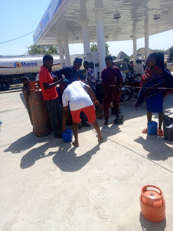 The image captures a bustling daytime scene at a Shema Petroleum Ltd fuel station in Dutsinma B, Nigeria