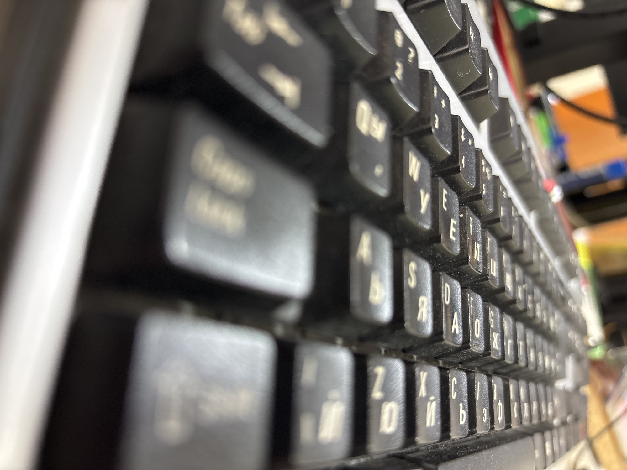 close-up view of a dirty, black computer keyboard with Cyrillic characters