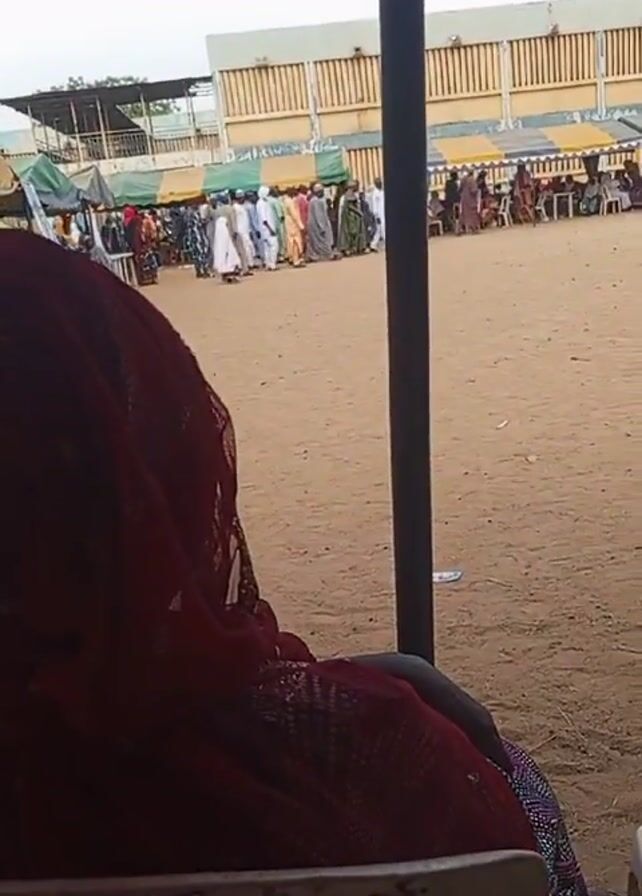 gathering on a sandy lot outside a building. People are milling around, some standing in lines, others sitting under tents. The camera is behind a person wearing a red head covering. It is daytime, and the sky is overcast. There is music playing in the background.