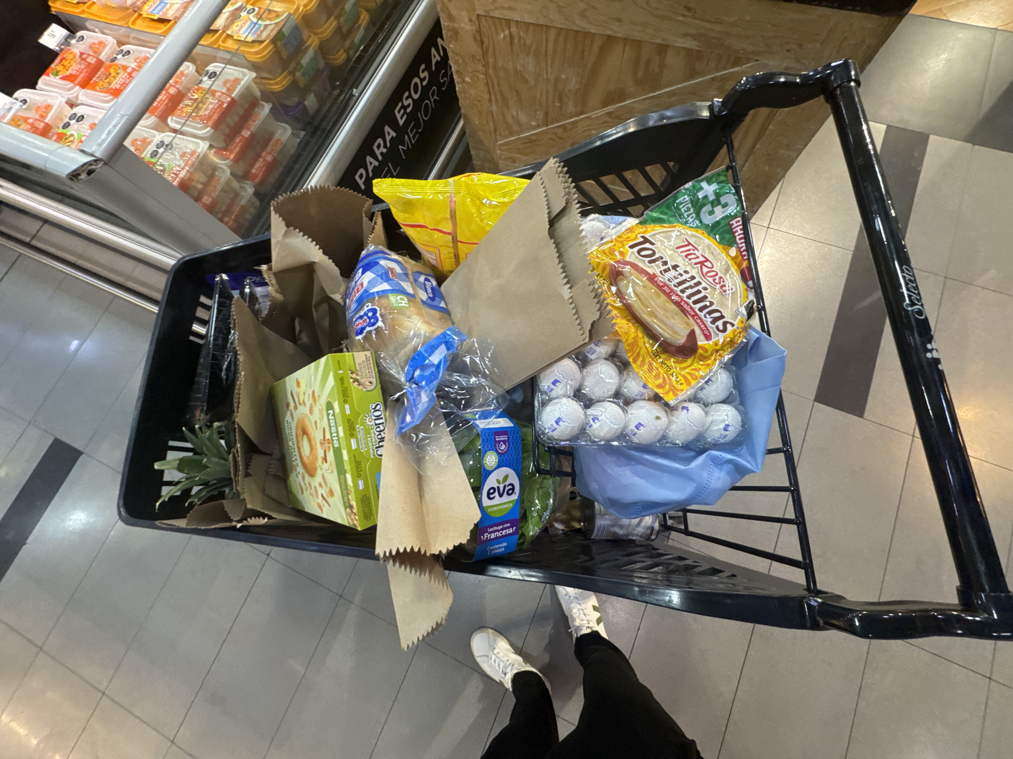 shopping cart viewed from above, filled with various grocery items. These include a box of Cheerios cereal, a bag of Tia Rosa tortillas, a carton of hydroponic lettuce from the brand "Eva", a loaf of Bimbo bread, a yellow bag of snacks, and a collection of white golf balls in a blue bag. There is also a pineapple in the cart. The person pushing the cart is wearing black pants and white sneakers, with only the feet and lower legs visible. The cart is in a supermarket aisle with refrigerated shelves stocked with processed foods visible in the background. The writing on the shelves indicates the location is in Mexico, as it's in Spanish. The shopping cart has the brand name "Selecto" written on its handle. The image suggests a recent grocery shopping trip.