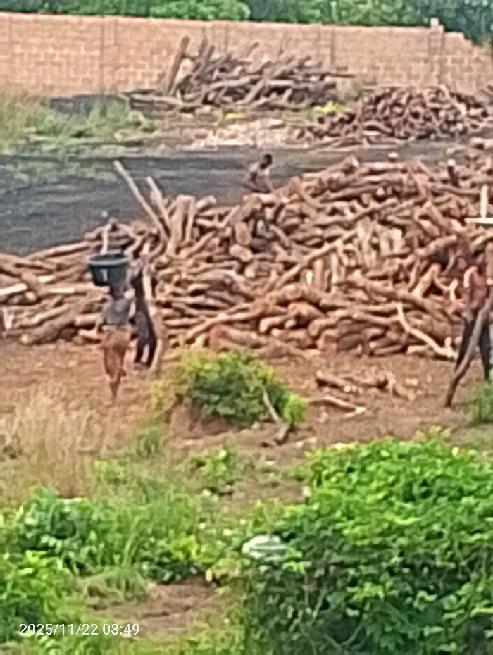 A blurry image shows two individuals near large piles of logs. One person is carrying a load on their head. Green foliage occupies the foreground, contrasting with the brown logs. In the background, a stack of wood sits near a brick structure. The overall scene appears to be a rural or underdeveloped area. A date stamp is visible at the bottom left corner.