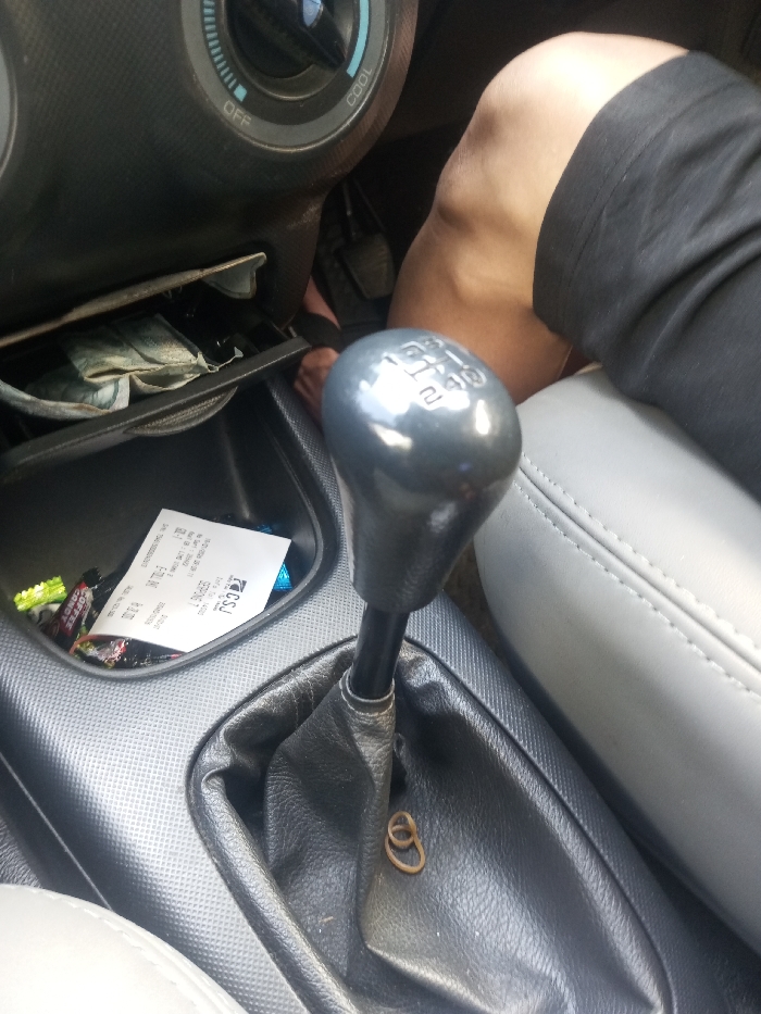 A car's interior is shown, focusing on the center console with a manual transmission gear stick. The gear stick has numbers indicating the gear positions. A rubber band rests near the base of the stick. Below the gear stick, a small storage compartment contains crumpled money, a receipt, and candy wrappers. A person's leg is visible near the seat.