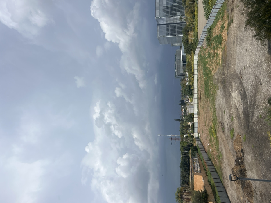 The image depicts an outdoor scene under an overcast sky, observed from an elevated perspective, likely in the industrial or high-tech zone of Raanana, Israel. The foreground features a large, irregular-shaped undeveloped dirt lot with sparse green and yellow vegetation. This lot is partially enclosed by a low metal fence on the left and a combination of off-white concrete panel fencing and metal fencing on the right. In the bottom-left, a dark grey lamppost is present, tilted, with a pile of earth next to its base. In the midground, beyond the undeveloped lot, a curved asphalt road is visible traversing from left to right. Along the road and in the surrounding areas, there are numerous green trees and shrubs. Prominent infrastructure includes a multi-band cellular tower on a lattice structure and an electricity pylon with power lines, both located towards the center-left. To the far left, partially obscured by trees and fencing, is a section of a light brown building. The background on the right is dominated by several modern, multi-story office buildings featuring extensive glass facades that reflect the cloudy sky. These structures are indicative of a commercial or business park. The sky occupies the upper two-thirds of the image and is heavily overcast with a mass of grey and white clouds. The clouds in the lower portion of the sky, closer to the horizon, are significantly darker, appearing a deep grey to almost black, suggesting a large cloud system or potential storm. No individuals or active movements are discernible within the frame.