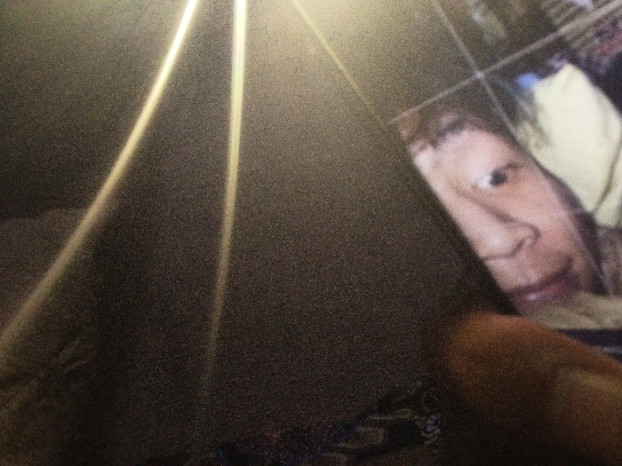 A dark, grainy image shows a person's face partially obscured by a dark object, potentially a laptop screen. Light streaks are visible. The person has a pale complexion and appears to be lying down. A hand is also visible.