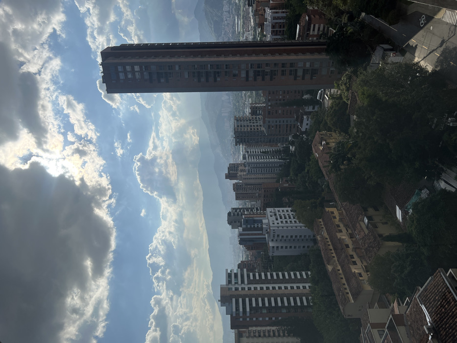 A high-angle cityscape is depicted under a bright, partially cloudy sky. Tall buildings of varying heights, mostly residential, fill the frame and are interspersed with trees and greenery. A very tall, thin skyscraper dominates the view. Misty mountains are visible in the background. A road with vehicles appears on the far right. The picture is rotated counterclockwise.