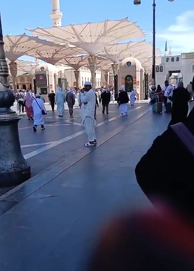crowd of people walking in a plaza in front of a large building with a tall minaret. The people are wearing a variety of clothing, including traditional Muslim attire. The plaza is paved with light grey stones and is covered with large, white parasols supported by tall metal poles. There are also street lamps visible. The sky is clear and blue. The camera is held by someone walking through the plaza, and their thumb is partially visible in the bottom right corner of the frame.
