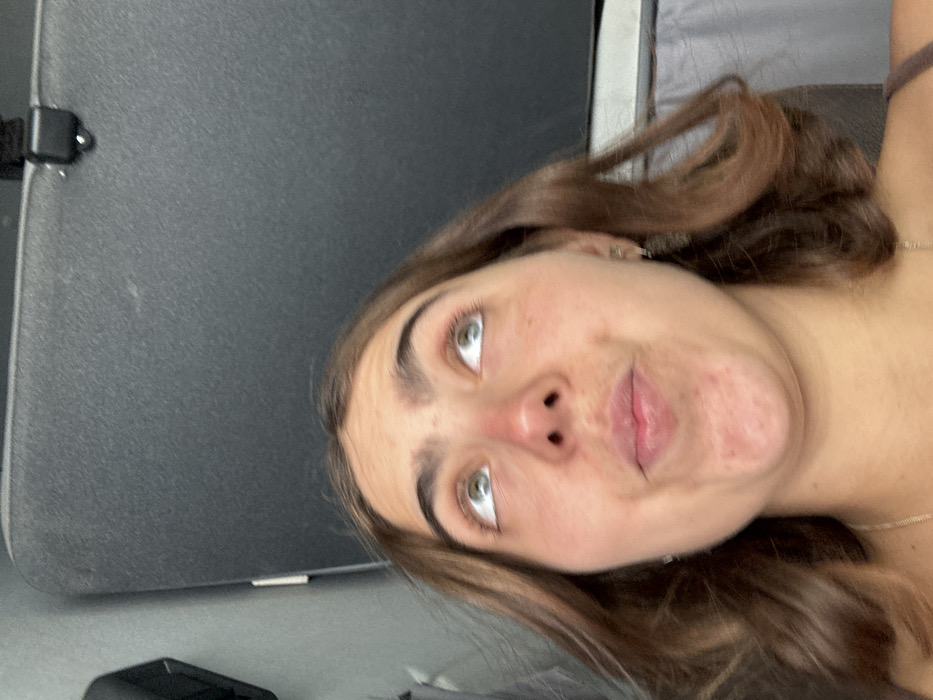 A young woman with light skin, brown hair, and green eyes looks upwards at the camera with a slight smirk. Her face shows some natural texture. A large, dark gray object, possibly a suitcase or equipment case, fills the left side of the frame. The background is blurry, suggesting a close-up shot indoors, potentially in a vehicle. The overall composition is casual and candid.