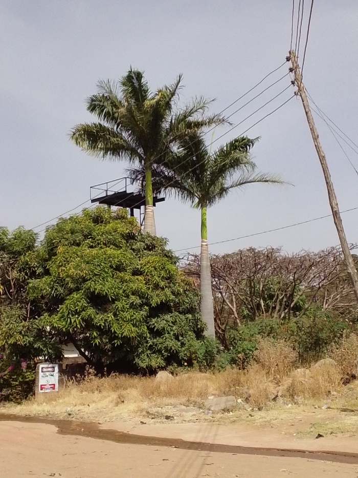 This image depicts an outdoor scene in Jos, Nigeria, under a clear, light blue sky. The foreground features a light brown dirt path or road, exhibiting darker, moist-looking patches on its surface. To the right of the path, the ground is covered with dry, yellowish-brown grass and sparse, low-lying vegetation, interspersed with several large, greyish rocks. Dominating the central and right portions of the frame are two tall, slender palm trees with green fronds at their crowns. The left palm tree has a wider, lighter-colored trunk base, while the right palm tree's trunk appears uniformly narrower. A dark-colored metal platform structure with railings is positioned between and partially behind the upper trunks of these two palm trees, appearing to be built at a significant elevation. Below and to the left of the palm trees, a large, dense tree with numerous green leaves is prominent, possibly a mango tree. Further to the right and behind the palm trees, a cluster of deciduous trees with bare branches and some green shrubs are visible. On the far right, a weathered wooden utility pole, leaning slightly, stands upright with at least four black electrical or telephone wires strung horizontally from it, extending towards the left side of the frame. In the lower left, partially obscured by green foliage, a white rectangular sign is visible. The sign features black text, with "JALINGO" prominently displayed at the top, followed by "HIGH SCHOOL" and other smaller, less legible lines including "TEL:" and "FAX:" numbers. A small red triangular warning symbol with an exclamation mark is also present on the sign. No people or animal subjects are visible, and no actions or interactions are depicted.
