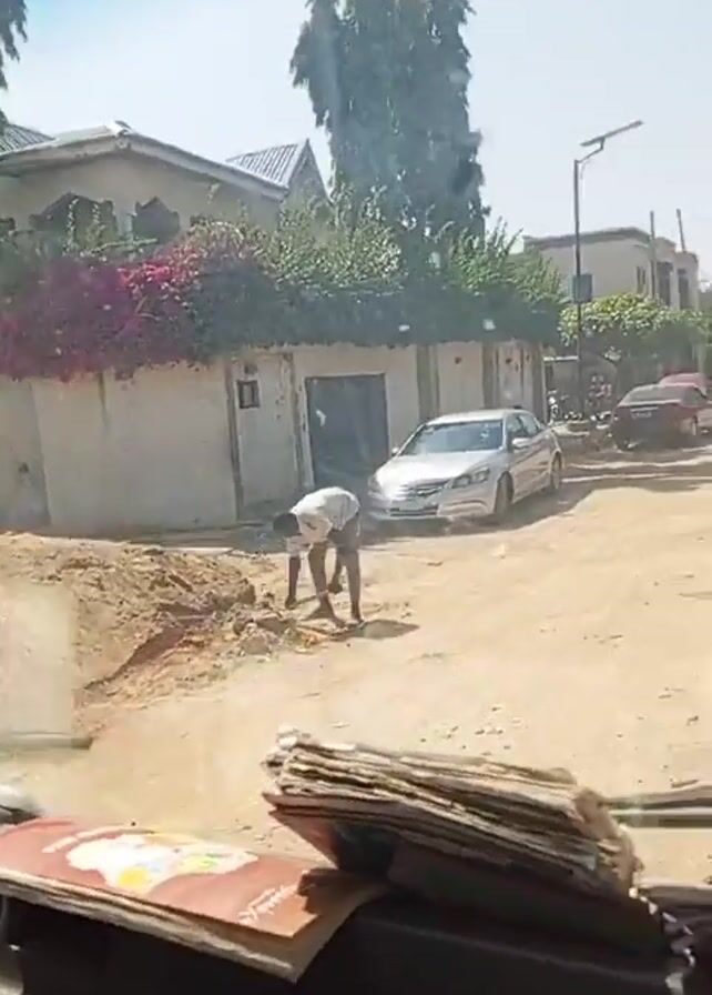 The video, taken from inside a vehicle, shows a man using a shovel to move dirt from a pile in the middle of a dirt road