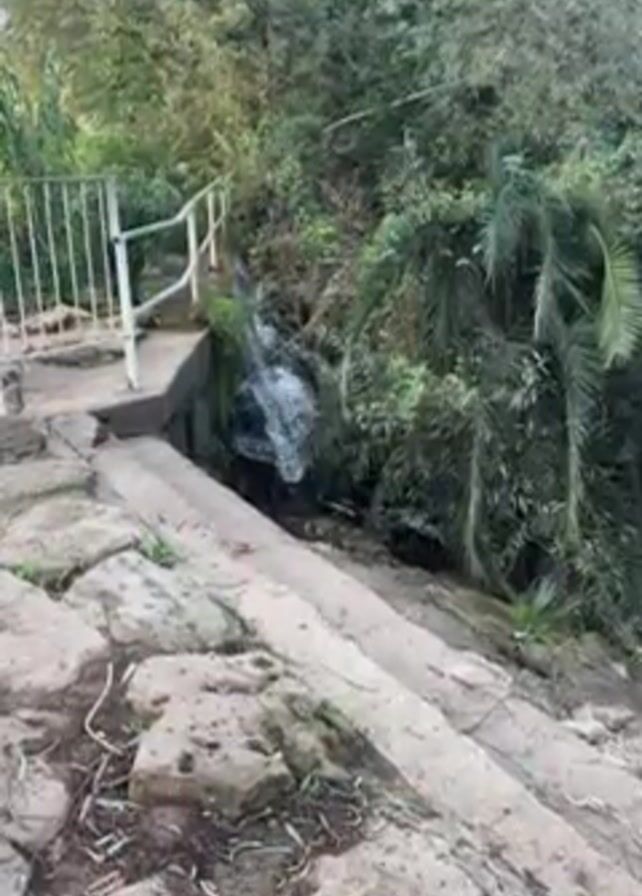 The camera is stationary, capturing a small waterfall in a natural, lush environment. The waterfall is the primary focal point, with water cascading over rocks and into a stream below. The surrounding area is filled with dense green vegetation, including trees and various plant species. A man-made structure is visible, featuring a concrete platform and stairs leading towards the waterfall. A white metal railing is positioned along the edge of the platform, providing a safety barrier. The overall lighting is soft, suggesting an overcast or shaded environment. The scene conveys a sense of tranquility and natural beauty.