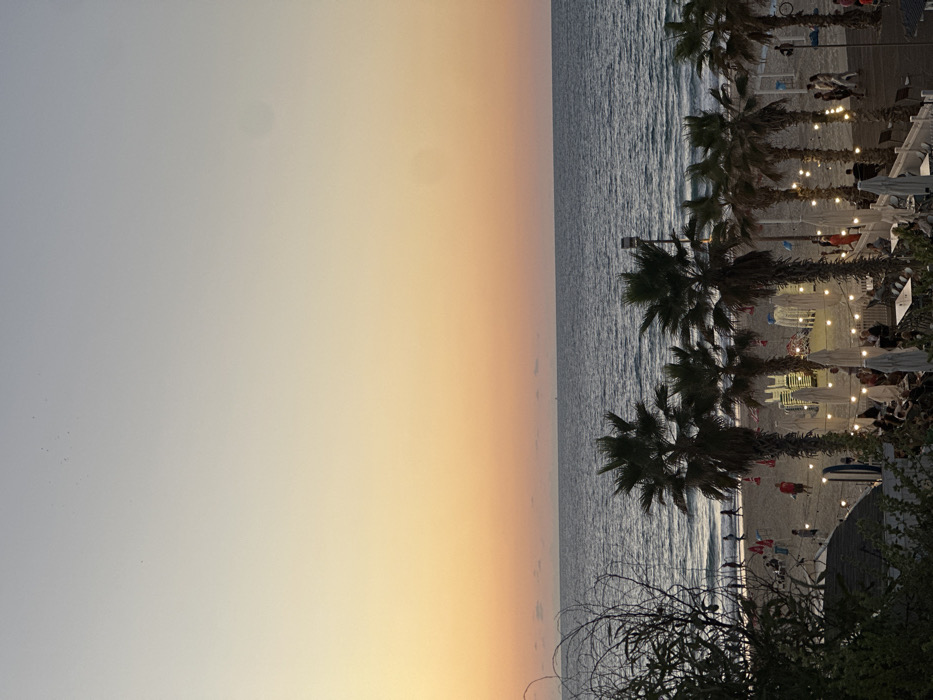 The image displays an evening scene on a beach in Bat Yam, Israel, during sunset. The sky exhibits a gradient from deep orange and yellow at the horizon to light blue-grey overhead. The Mediterranean Sea occupies the middle ground, presenting dark blue water with a calm surface. The sandy beach in the lower half of the image features approximately twelve individuals. Three figures are walking along the waterline on the wet sand in the mid-left. A row of eight palm trees lines the beach, behind which a beachside restaurant or bar operates. This establishment is illuminated by string lights with visible bulbs, casting a warm glow on numerous white tables and chairs. Approximately twenty individuals are seated at these tables, engaged in social interaction. Several white umbrellas are present, some folded. Stacks of white plastic chairs are visible on the sand near the establishment. Dark green leafy vegetation frames the far left foreground.