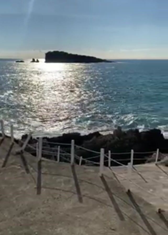 n ocean view from a rocky coastline under a bright, sunny sky. The sun glints off the water's surface. A small, uninhabited island is visible in the distance. A concrete walkway with a low, white rope railing leads down to the rocky shore. Waves crash against the rocks.