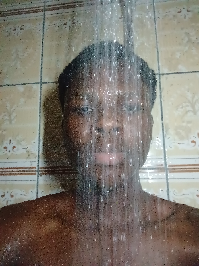 A person stands under a stream of water in a shower. The water obscures much of the face, but the eyes, nose, and mouth are visible. The person has dark skin and short hair. Tiles with a floral pattern line the shower wall. The lighting is dim, creating a soft shadow to the left of the person's face. The person's shoulders and chest are also visible.