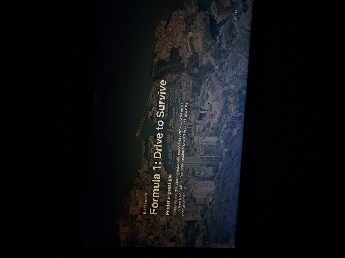 The image displays a television or monitor screen with black bars occupying approximately the upper 40% and lower 10% of the frame. The central portion features an aerial or high-angle nighttime view of a coastal city identified as Unknown, Unknown. Numerous multi-story buildings with illuminated windows are visible, terraced on hillsides. A prominent harbor or marina occupies the central-right, containing multiple docked vessels and a breakwater extending into the dark body of water. Overlaid text in white on the lower half of the screen reads: "Estás viendo" (You are watching), followed by the title "Formula 1: Drive to Survive," and below that, "Perder el prestigio" (Losing prestige). Further below, a partial description in Spanish states, "Todas las miradas y las expectativas recaen sobre Nyck de Vries en su debut en la Fórmula 1. Con tanta presión sobre sus espaldas, le cuesta mantener el ritmo." (All eyes and expectations fall on Nyck de Vries in his Formula 1 debut. With so much pressure on his shoulders, he struggles to keep pace.) In the bottom-right corner of the content area, the word "Pause" is visible. No individuals are depicted within the visual scene; actions and interactions are only referenced in the overlaid text.