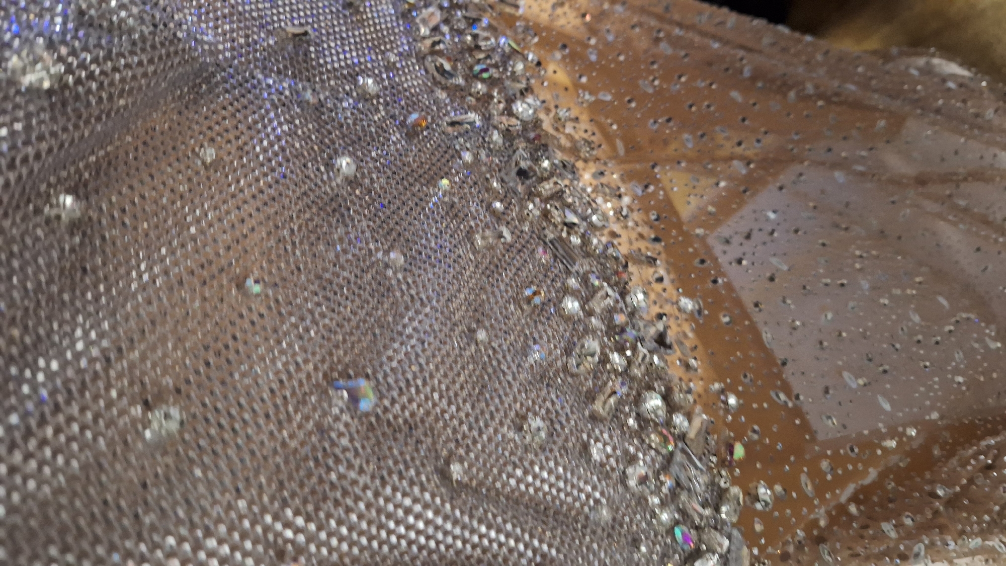 The image depicts a close-up of a textile surface, possibly fabric or mesh, heavily adorned with small, reflective embellishments resembling rhinestones or sequins